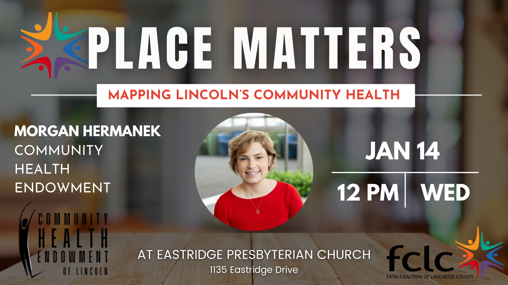 Join us for the January gathering of the Faith Coalition of Lancaster County as we welcome Morgan Hermanek from the Community Health Endowment (CHE). She’ll share insights from Place Matters 6.0, a mapping project that visualizes health disparities across Lincoln—from youth fitness and poverty to access to healthy food and disability support.
